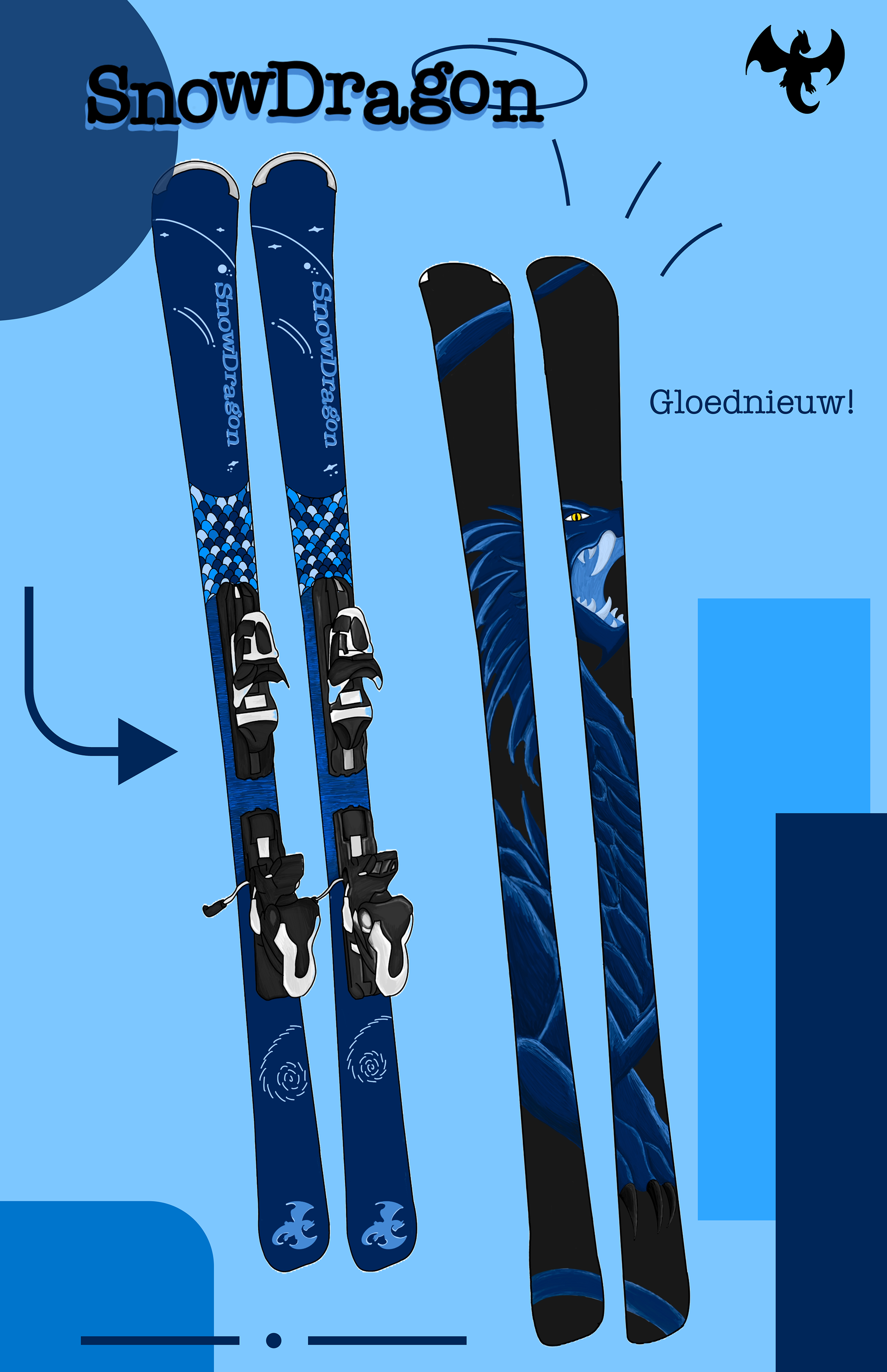 De ski's in het midden waren voor beeldbeschouwing. Een vak dat ik niet zo heel leuk vond maar deze opdracht was een ander verhaal. De bedoeling was dat we met een ontwerp onze band met de natuur beschreven. Mijn band met de natuur is voornamelijk op ski's met sneeuw. Dus ik dacht laat ik mijn eigen ski's ontwerpen. De gedachtegang achter het ontwerp is voornamelijk dat ik het stom vond dat snowboards altijd op de achterkant een vette illustratie of ontwerp hebben staan en ski's dat vaak niet hebben. Dus ik dacht, laat ik daar mijn concept van maken. Een draak die zich laat zien door de twee ski's naast elkaar te zetten. Waarom een draak? Omdat dat vaak als "cool" wordt gezien. En ikzelf vind ze super interessant.